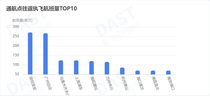 从通航点来看,南阳TOP10航点包括深圳、广州、乌鲁木齐、上海浦东、揭阳潮汕、兰州、杭州、海口、南昌、南京,其中前6个航点航班量均超过100个。