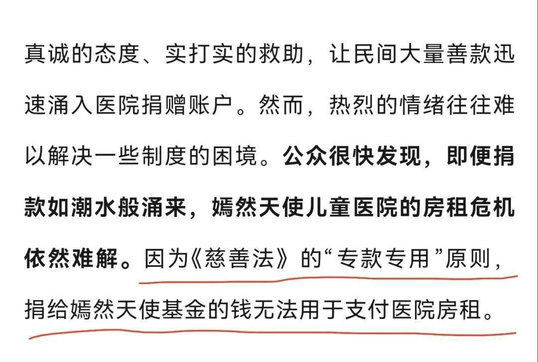 文章里还说明了,这段时间大家捐了不少钱,可医院的房租难题怎么还是没解决。原来医院得按慈善法“专款专用”的规定来,社会捐的钱不能拿来付房租……
