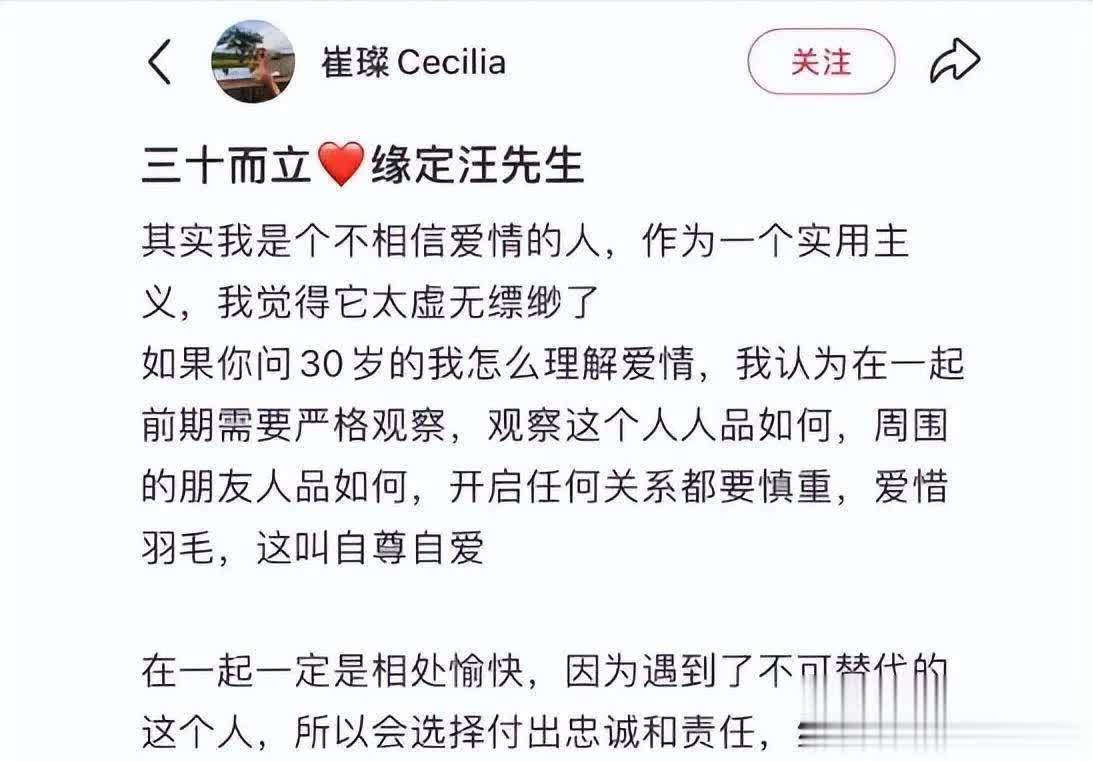 然而,崔璨却在社交平台上表达了她对汪雨深厚的感情。汪雨已年过三十,对于爱情的信心逐渐变得谨慎,结婚对他来说是件需要特别慎重的事。但对于崔璨来说,汪雨却是她生命中不可或缺的存在。她的每一句话里,都充满了幸福的光辉,像是看到了命中注定的那个他。